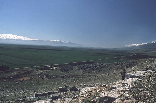 Looking SE across the southern Bekaa valley, from the Barouk massif to the snowy Mount Hermon. The western (left) side of the valley is defined by the Yammouneh fault. The valley, at an elevation of 800m above sea level, is an important modern depocentre receiving debris from the eroding anticlines around the flanks.